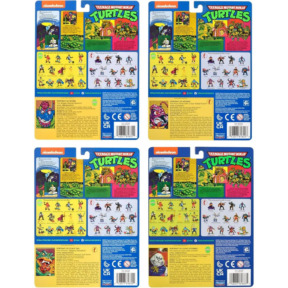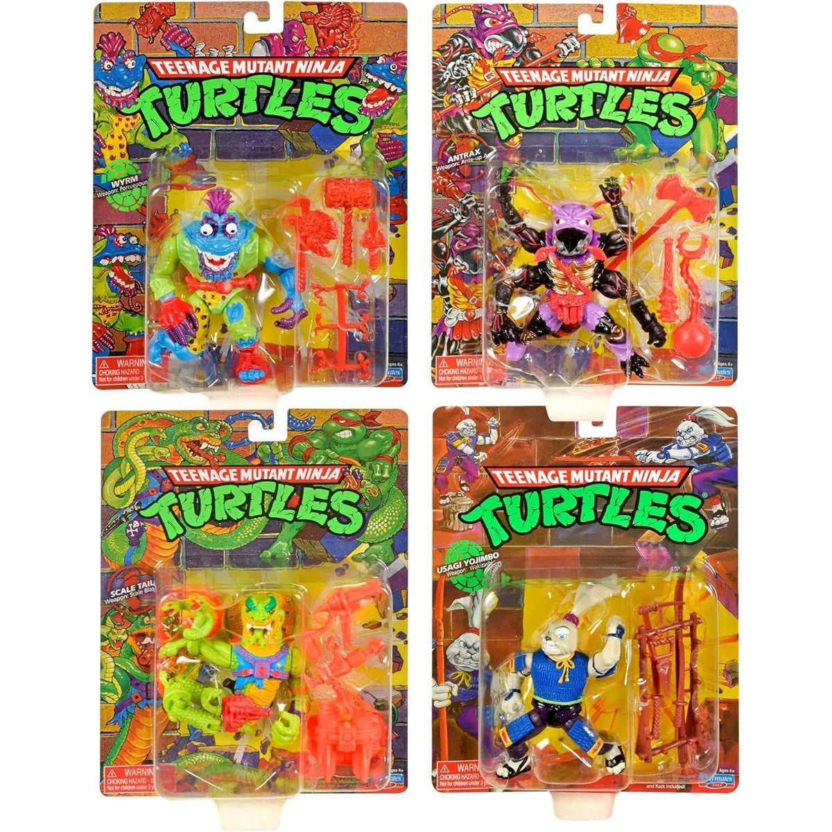 The figures in this Classic TMNT set are authentically sculpted and decorated as they appeared in the original 1990's TMNT toy line. Each fully detailed and poseable figures stand at approximately 4-inches tall. Antrax carries his Ante-Up Axe with Nasty Noose, The Old Ball & Chain, and Beat 'Em Back Bat. Scale Tail uses his Vicious Venom Pistol, Wattage Whip, Scale Shooter, and Belly Bustin' Backpack. Wyrm has his Trash Compactor Mallet, Porcuepounder, Worm Knife, Worm Belt, and mini worms. Usagi Yojimbo wields his Naginata, Wakizashi, Tanto, Katana, and a Wacky Weapons Rack. Each figure comes in Classic packaging- blister card and original TMNT graphics, just like in the 1980's!